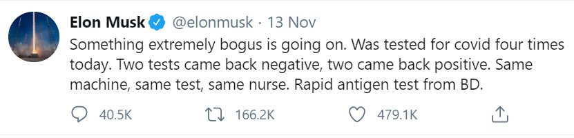 Es wurde berichtet, dass der CEO von Tesla, Elon Musk, am 13. November einen Tweet bezüglich einer Mischung aus positiven und negativen PCR-Tests am selben Tag veröffentlicht hat.